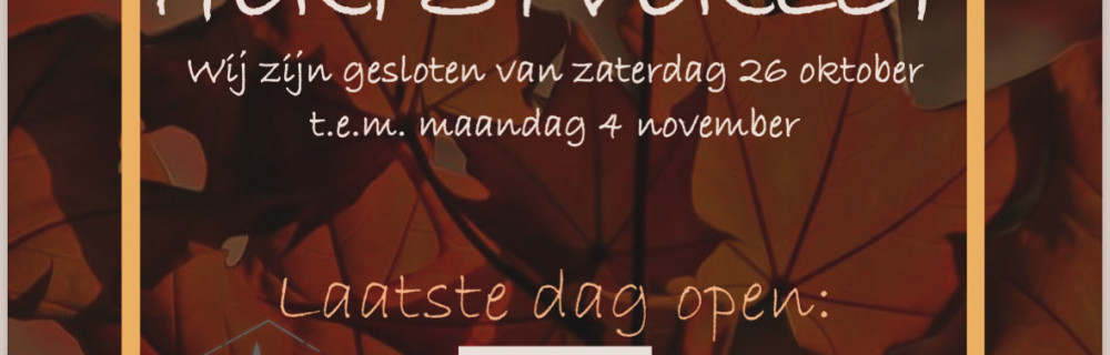 We zijn gesloten van vrijdagMIDDAG 25 oktober t.e.m. maandag 4 november. Dinsdag 5 november zijn we terug open vanaf 10u! Wij genieten een weekje van wat quality time met onze gezinnetje voor de helse drukte van de eindejaarsperiode.
